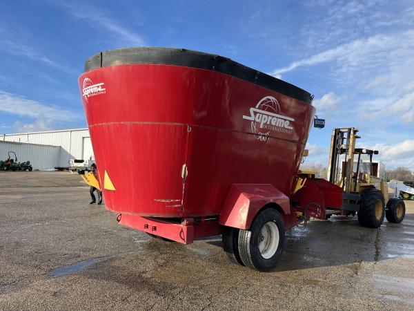 2015 SUPREME INTERNATIONAL 900T PULL TYPE VERTICAL MIXER, MAX PAYLOAD OF 24,000#, 841 ft³ STRUCK CAPACITY W/ RUBBER TUB EXTENSION, REQUIRES 130HP TO RUN, (4)- NEW 11R/22.5in 16 Ply TRUCK TIRES- SINGLE AXLE W/ DUALS, SMALL 1000 PTO, DIGI-STAR SCALE, CONVEYOR, NEWER LINERS, NEW SCREWS, NEW APRON CHAIN. Before driving to see this item, please call or email to confirm availability.