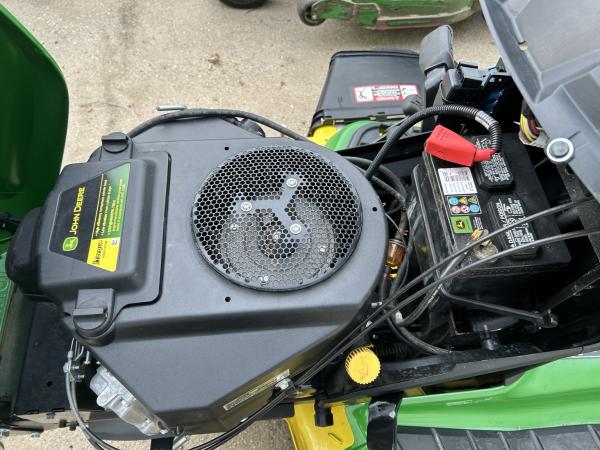 2020 JOHN DEERE X380 LAWN TRACTOR, 23HP KAWASAKI ENGINE, FOOT LIFT DECK, MANUAL STEERING, 54" DECK, FRONT BUMPER. NICE MOWER. Before driving to see this item, please call or email to confirm availability.
