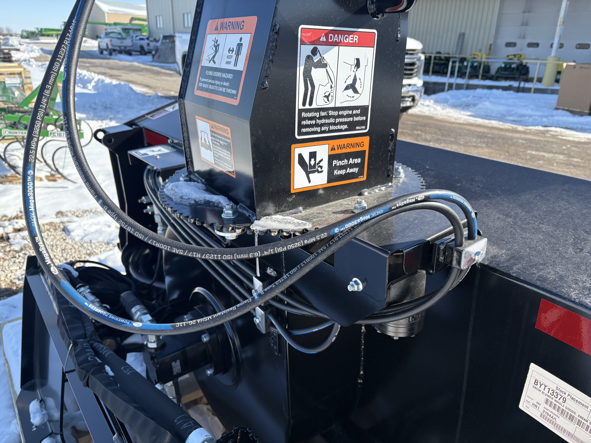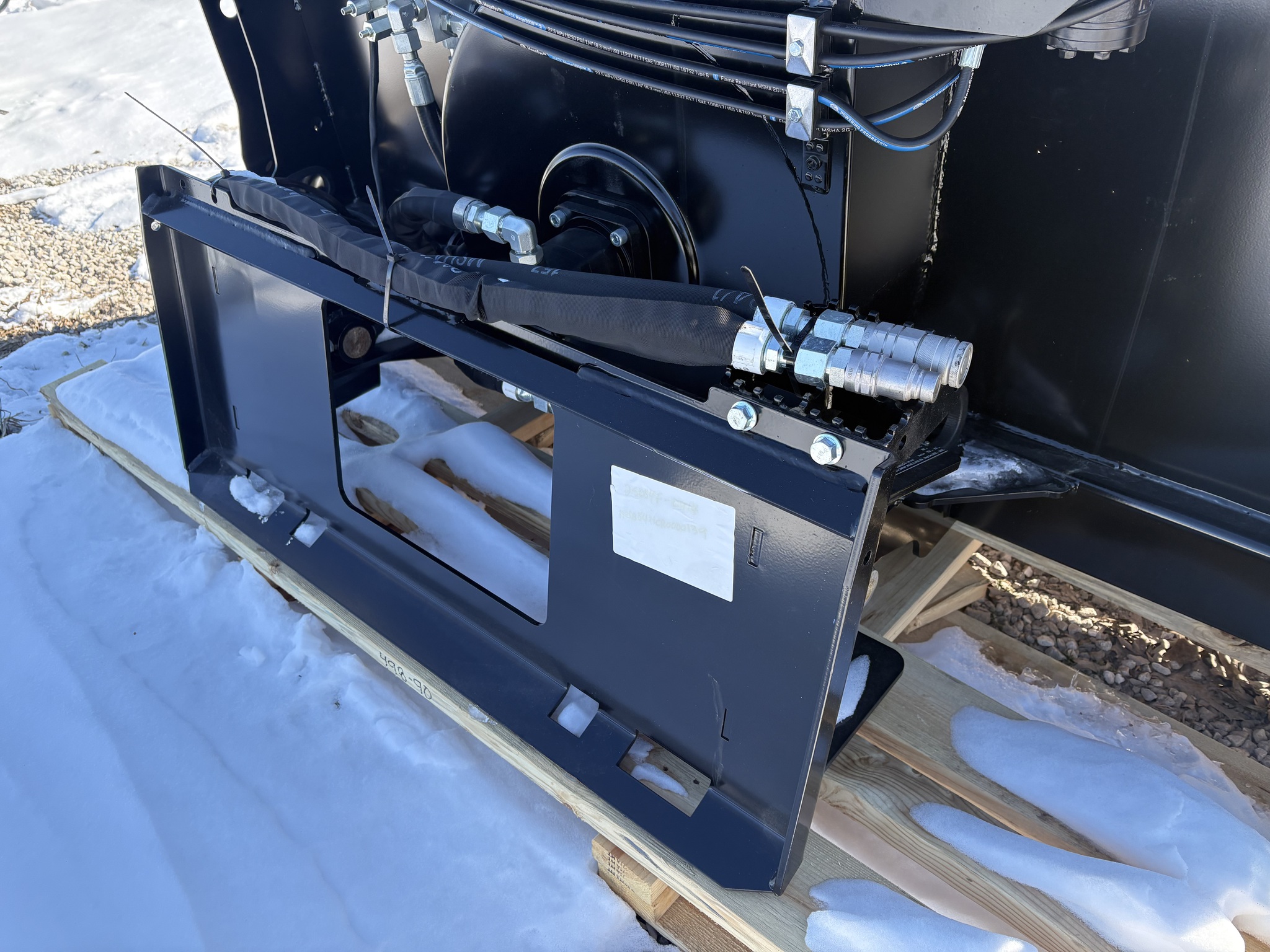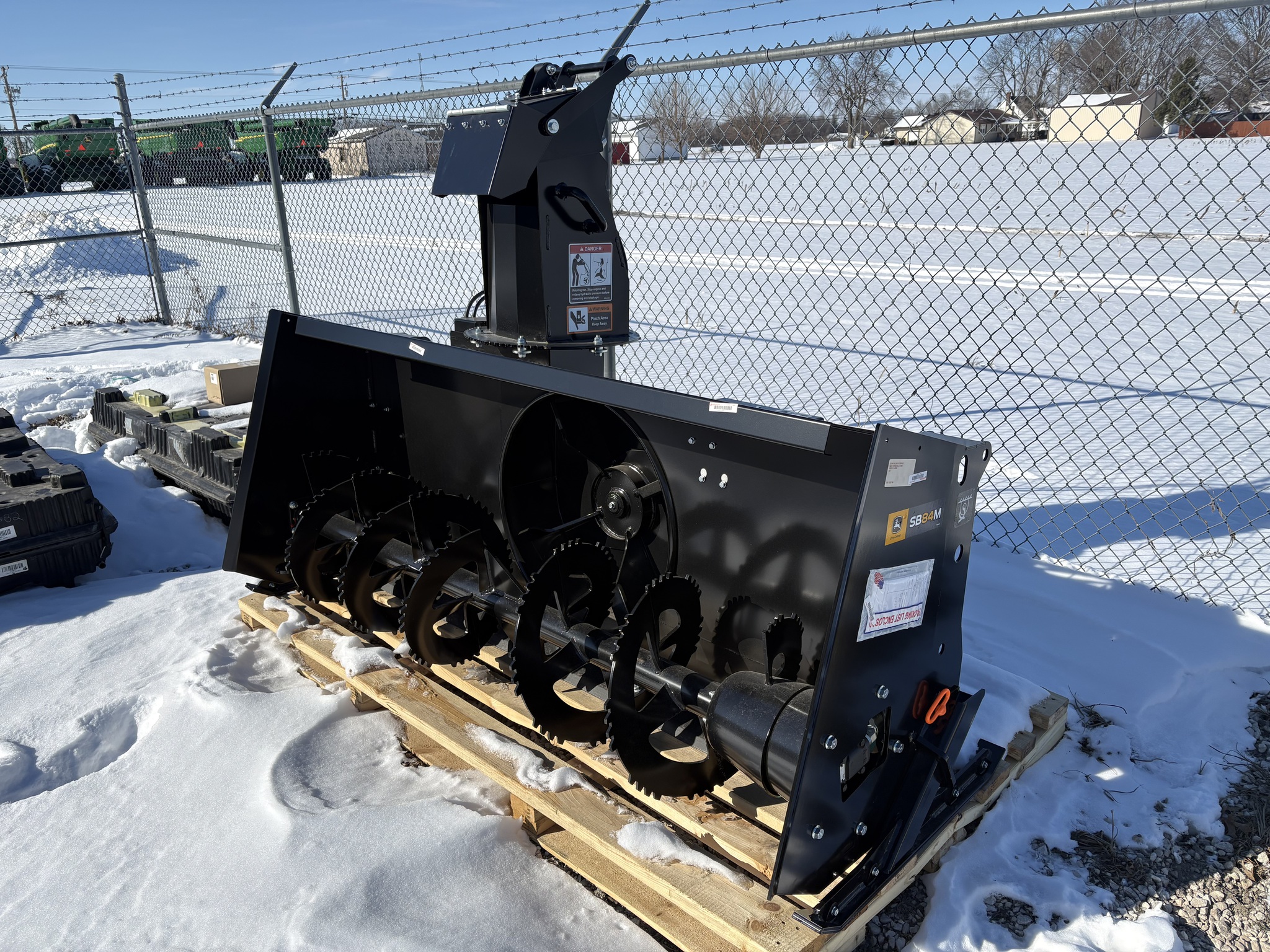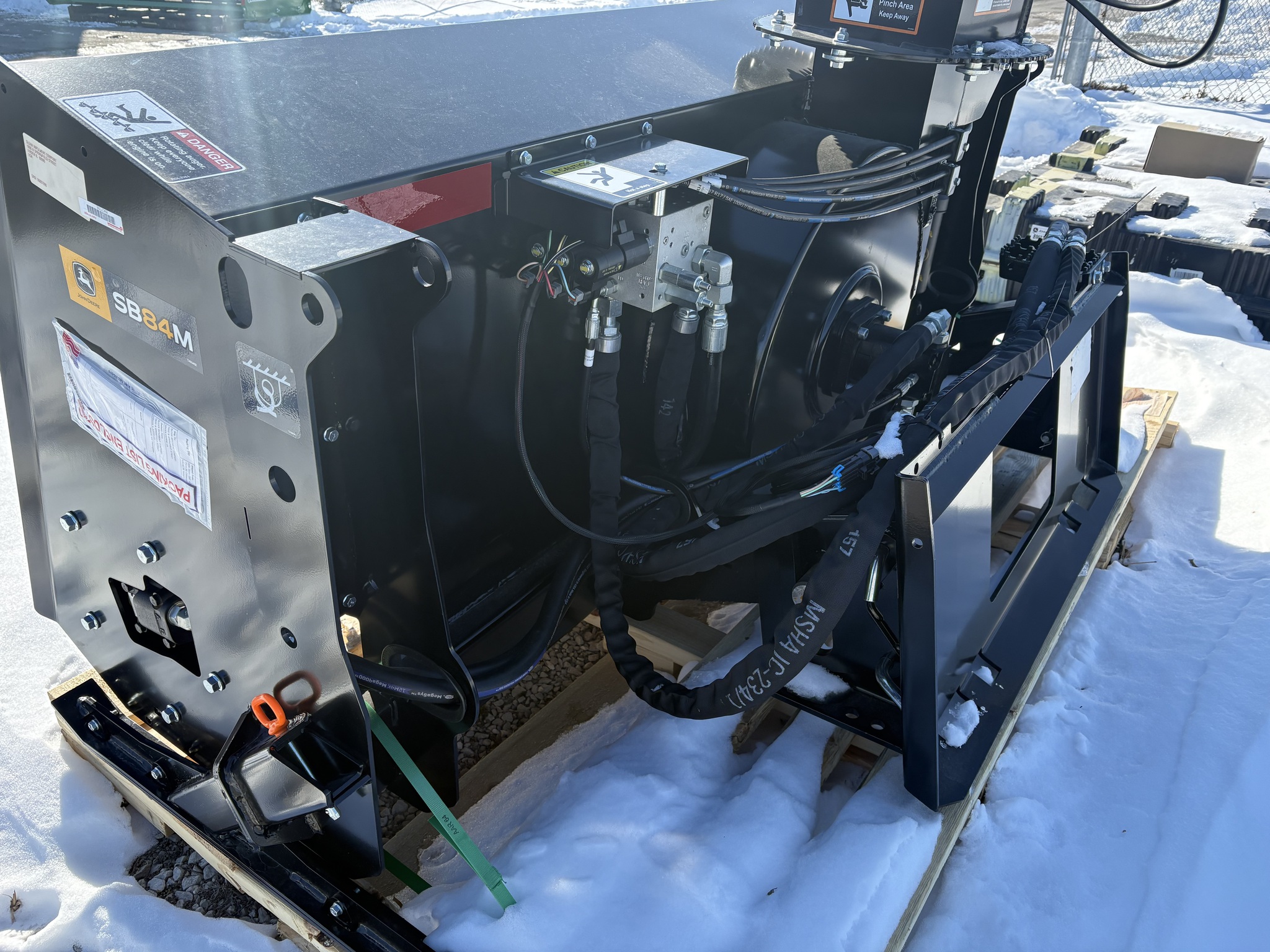 New SB84M, Two-stage hydraulic snow blower, throws snow up to 45ft, Direct drive motors at the auger and impeller, High volume intake shroud, Hydraulically actuated dual articulated chute and deflector, Adjustable skid shoes, 35-45gpm hydraulic flow range, Serrated Auger...Before driving to see this please call or email to confirm location and availability...