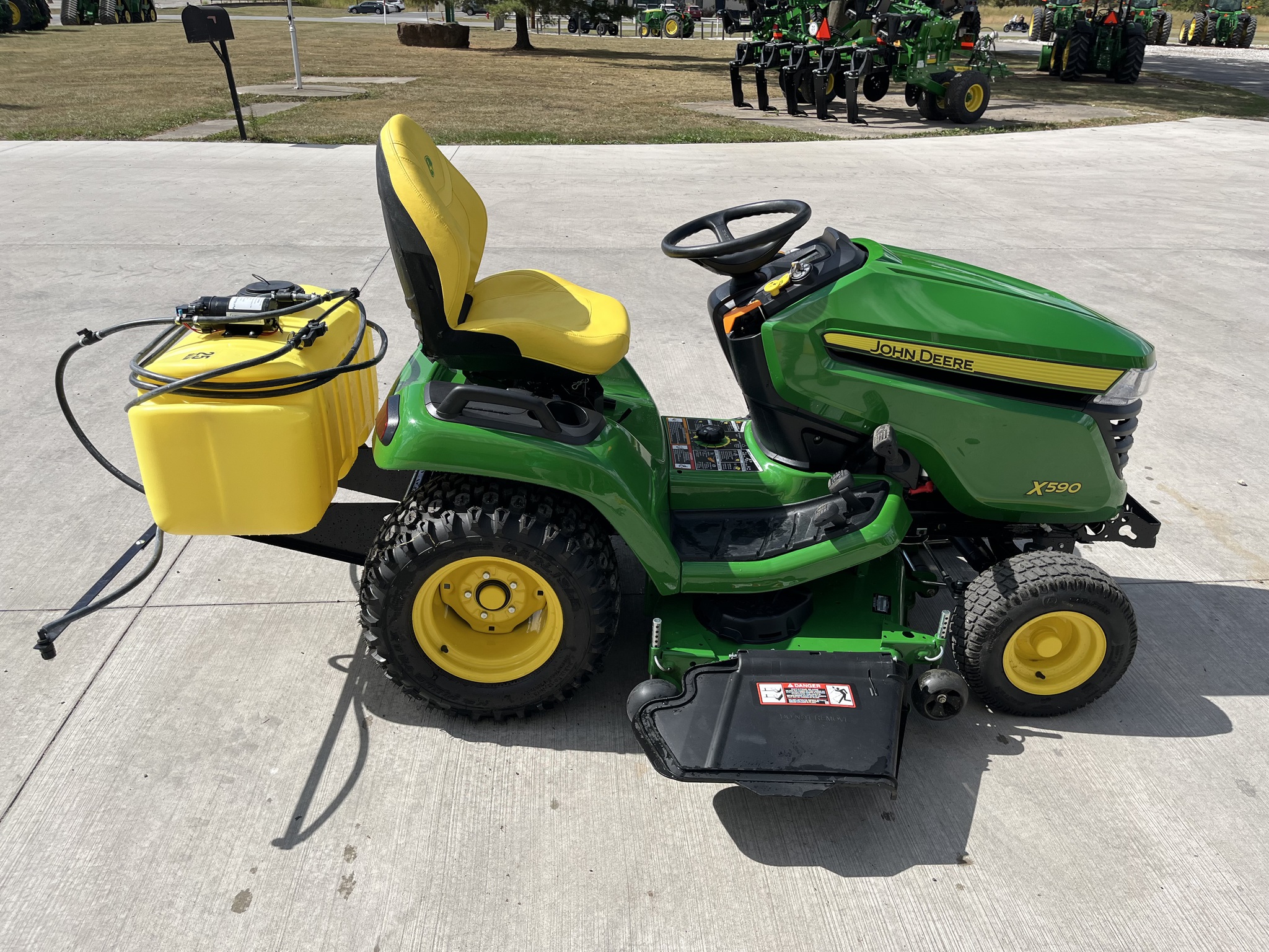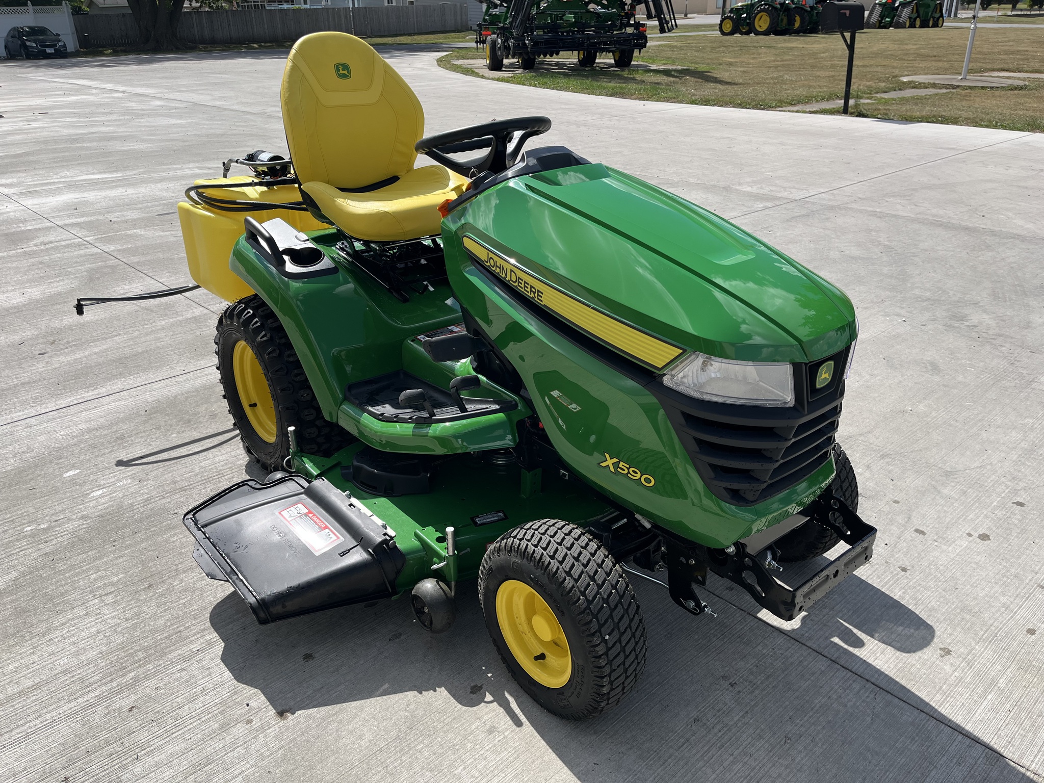 2025 JOHN DEERE X590 GARDEN TRACTOR, 48" DECK, 25.5HP EFI KAWASAKI ENGINE, P/S, POWER DECK LIFT, REAR DIFF LOCK, HDAP TIRES. NEW 25GALLON SPRAYER. FACTORY WARRANTY UNTIL 10-10-2028 OR 500 HOURS WHICHEVER COMES FIRST. Before driving to see this item, please call or email to confirm availability.