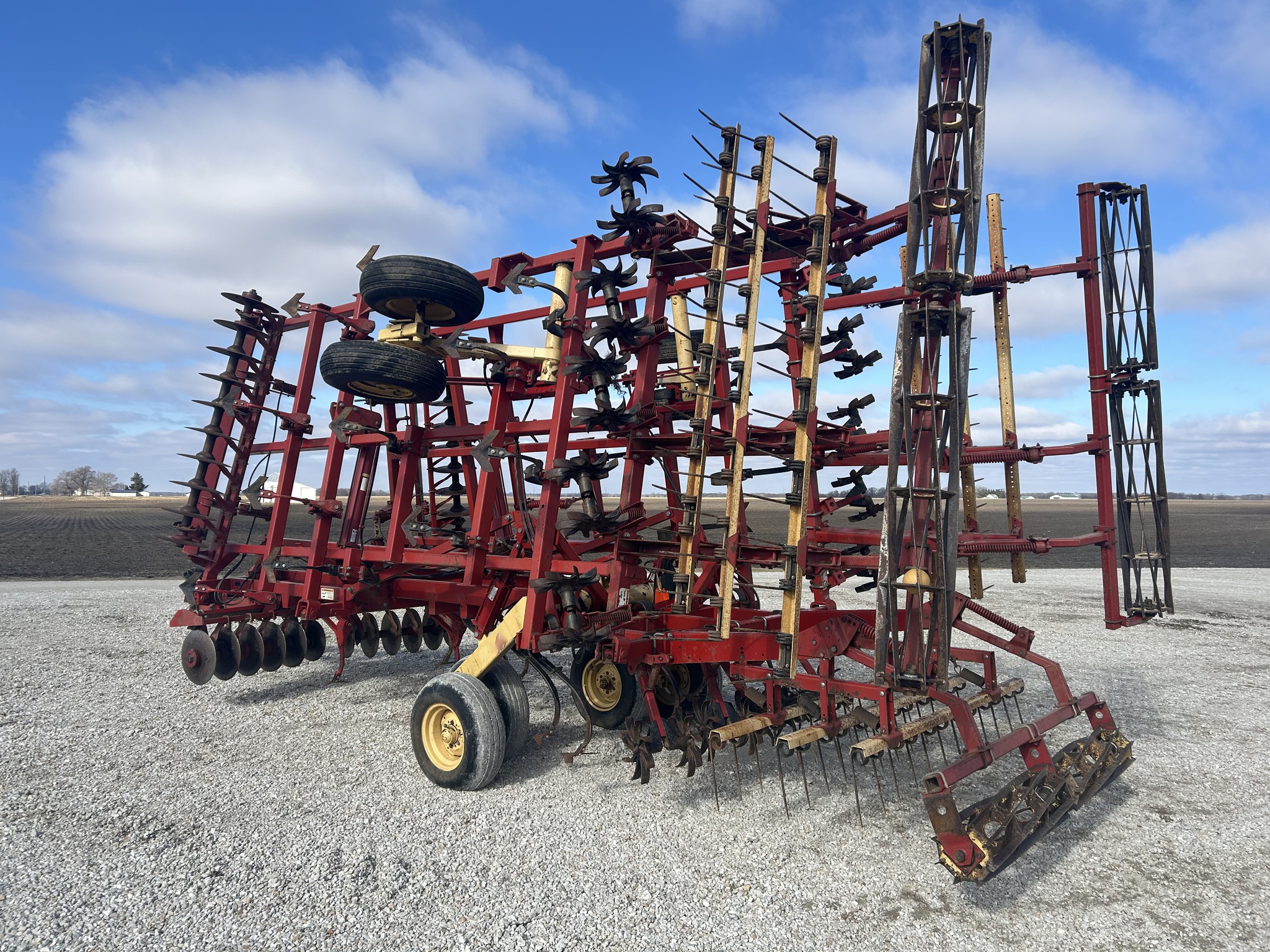 24' KRAUSE LANDSTAR FINISHER...HYD. ADJUST FRONT DISKS...9" SPACING ON DISKS...SPRING SHANKS ON FRONT RANK FOLLOWED BY K-TINE SHANKS...9" SWEEPS...WALKING TANDEMS...LEVELING STAR WHEELS...3 BAR COIL TINE W/FLAT BAR ROLLING BASKET...DECENT SHAPE FOR AGE...