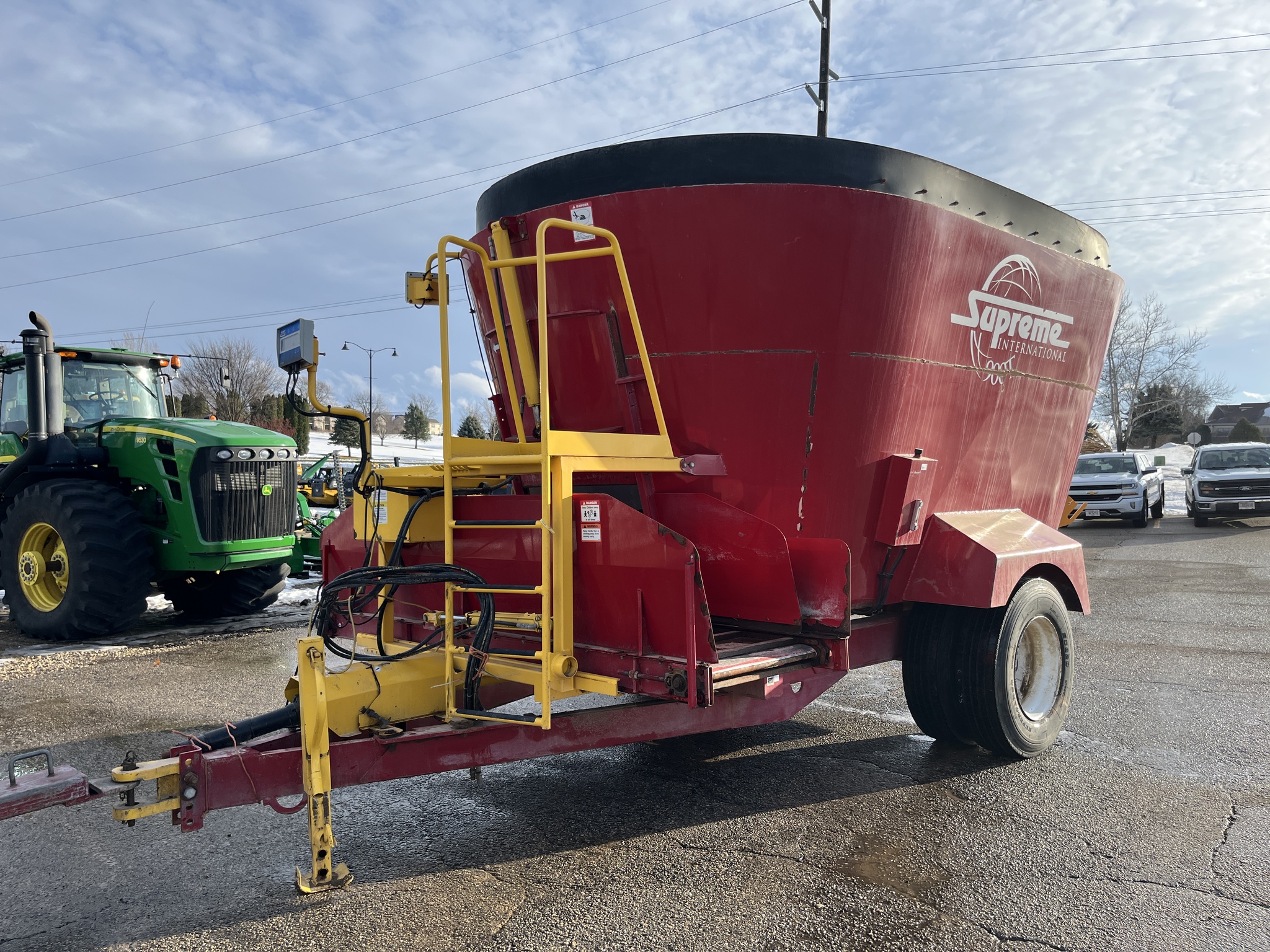 2015 SUPREME INTERNATIONAL 900T PULL TYPE VERTICAL MIXER, MAX PAYLOAD OF 24,000#, 841 ft³ STRUCK CAPACITY W/ RUBBER TUB EXTENSION, REQUIRES 130HP TO RUN, (4)- NEW 11R/22.5in 16 Ply TRUCK TIRES- SINGLE AXLE W/ DUALS, SMALL 1000 PTO, DIGI-STAR SCALE, CONVEYOR, NEWER LINERS, NEW SCREWS, NEW APRON CHAIN. Before driving to see this item, please call or email to confirm availability.
